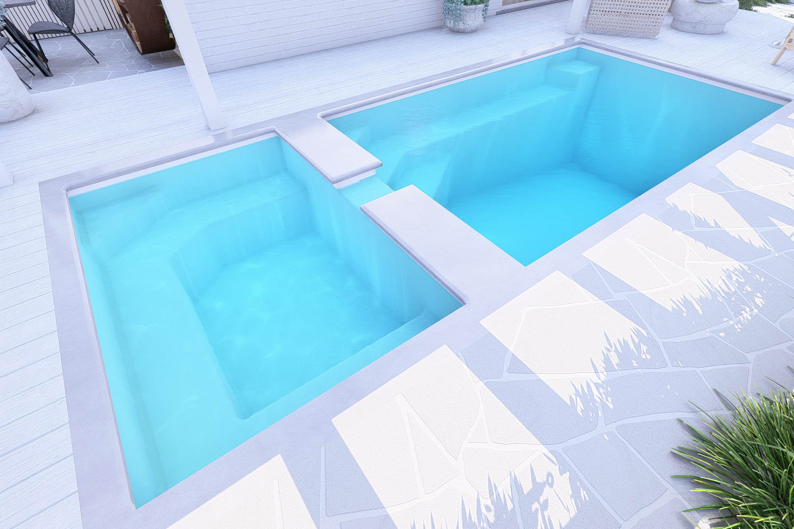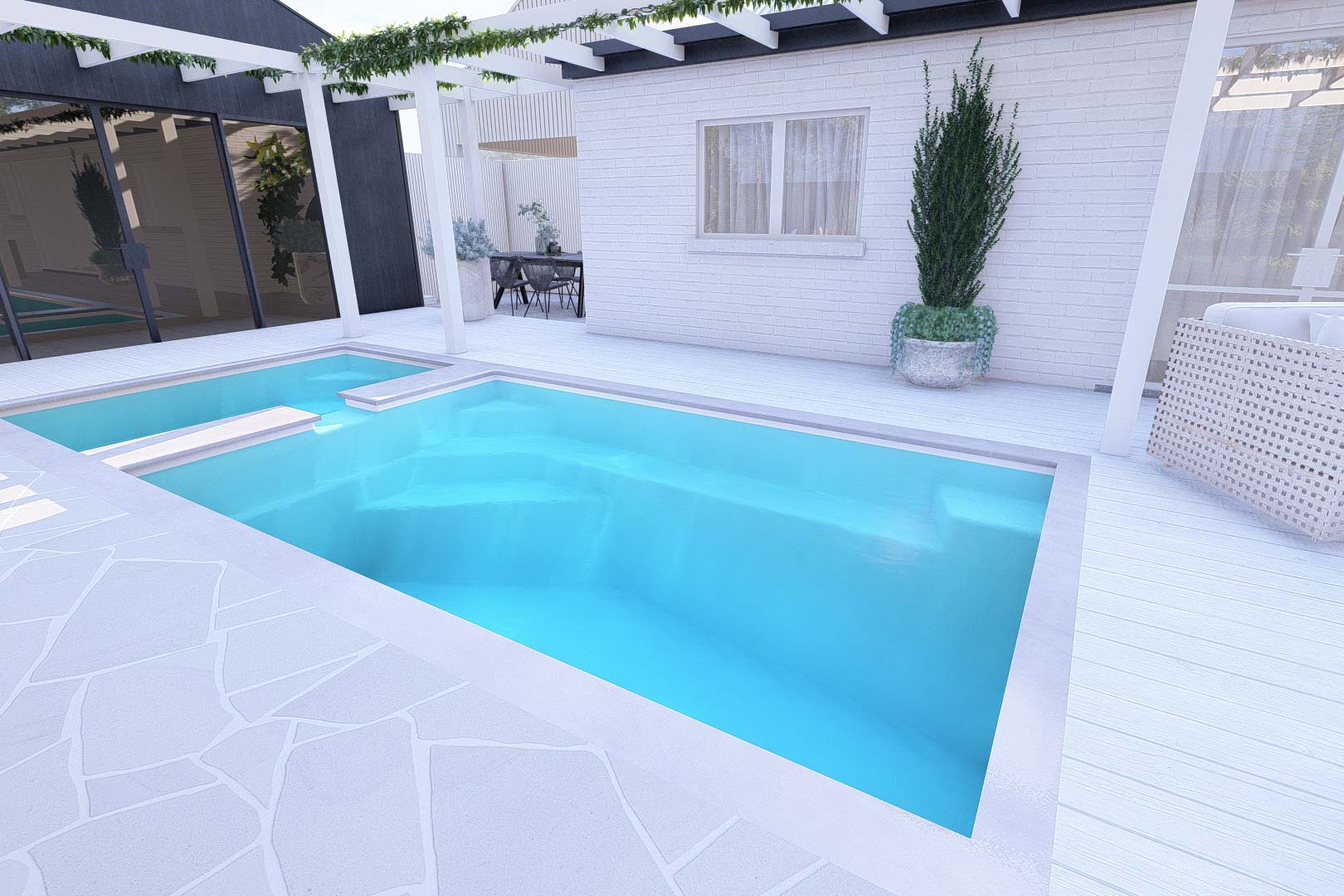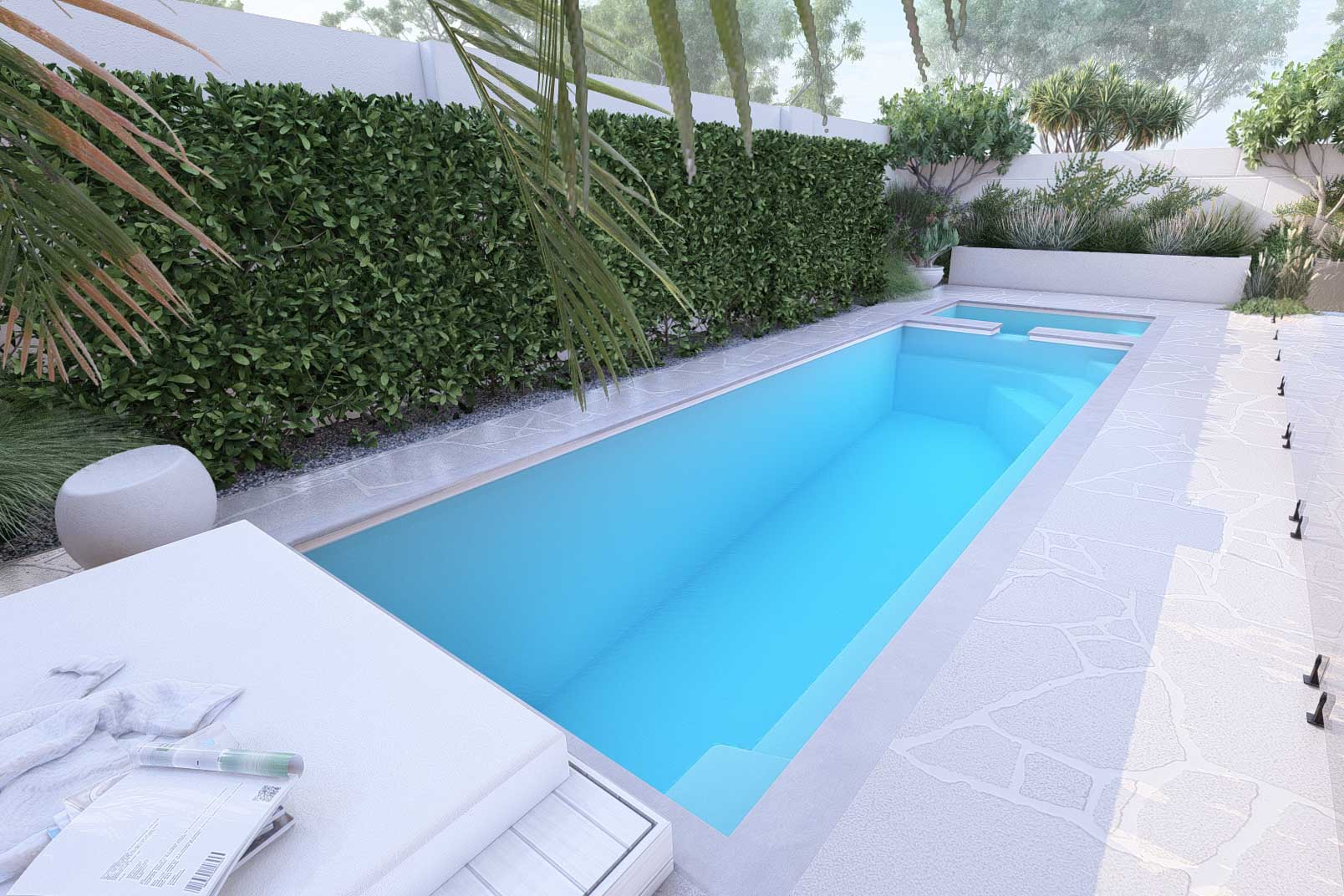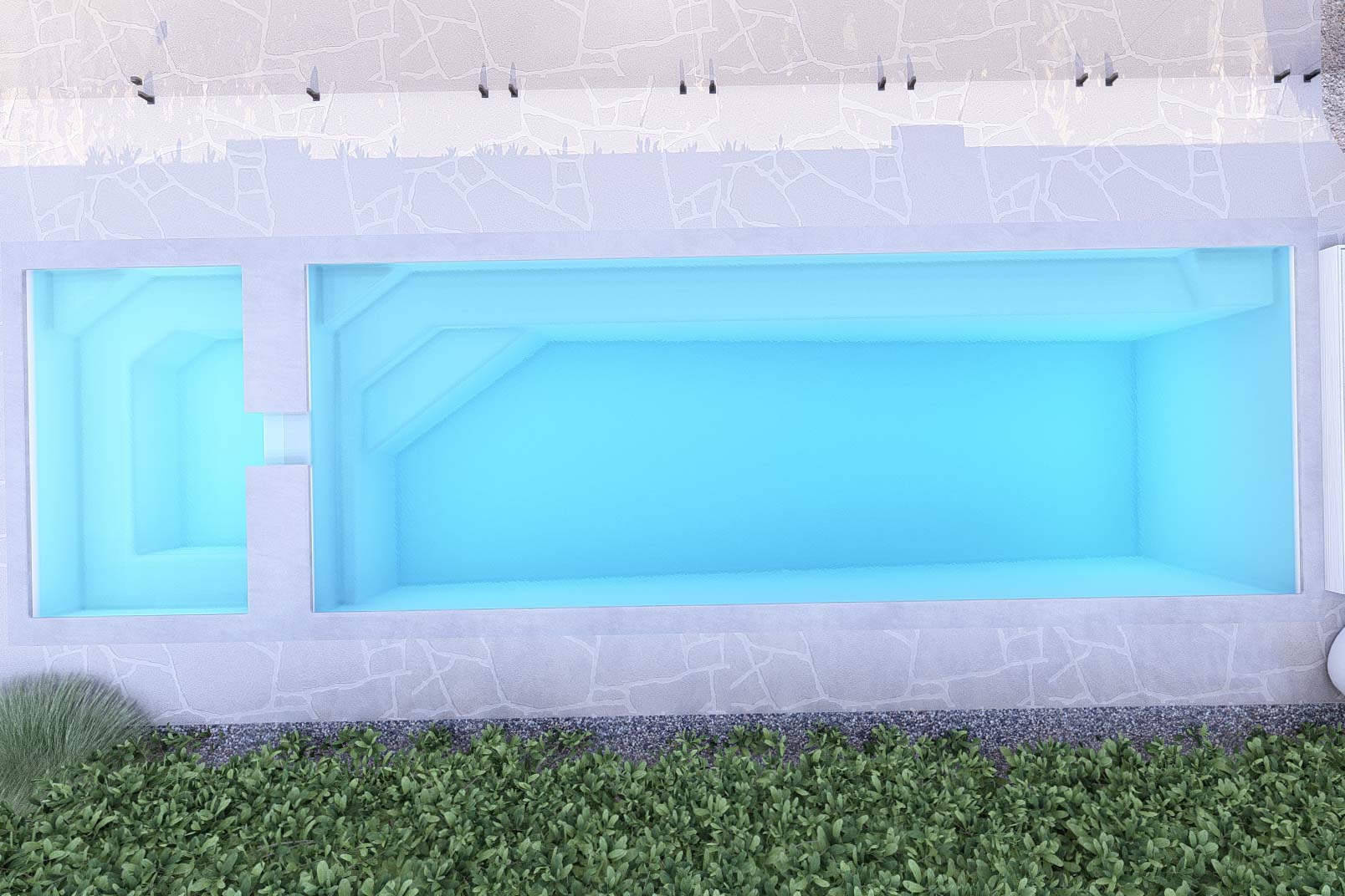 A stunning one piece configuration that has been designed with the whole family in mind. The entry point steps down into a versatile bench seat which runs the full length of the pool creating a generous seating & kids play area all in one. Designed with a spillway the pool and spa can run simultaneously eliminating any additional power costs, alternatively they can be run independently. The generous swimming area has been designed to be totally un-obstructed, which is ideal for swimming laps and active families. There is no other pool that can offer all of these features. With its square lines and designer looks we are sure your whole family will love it.