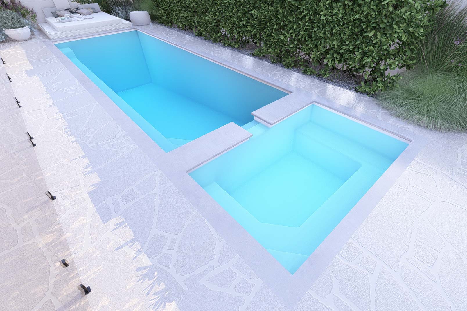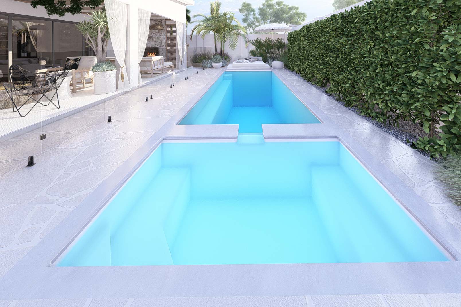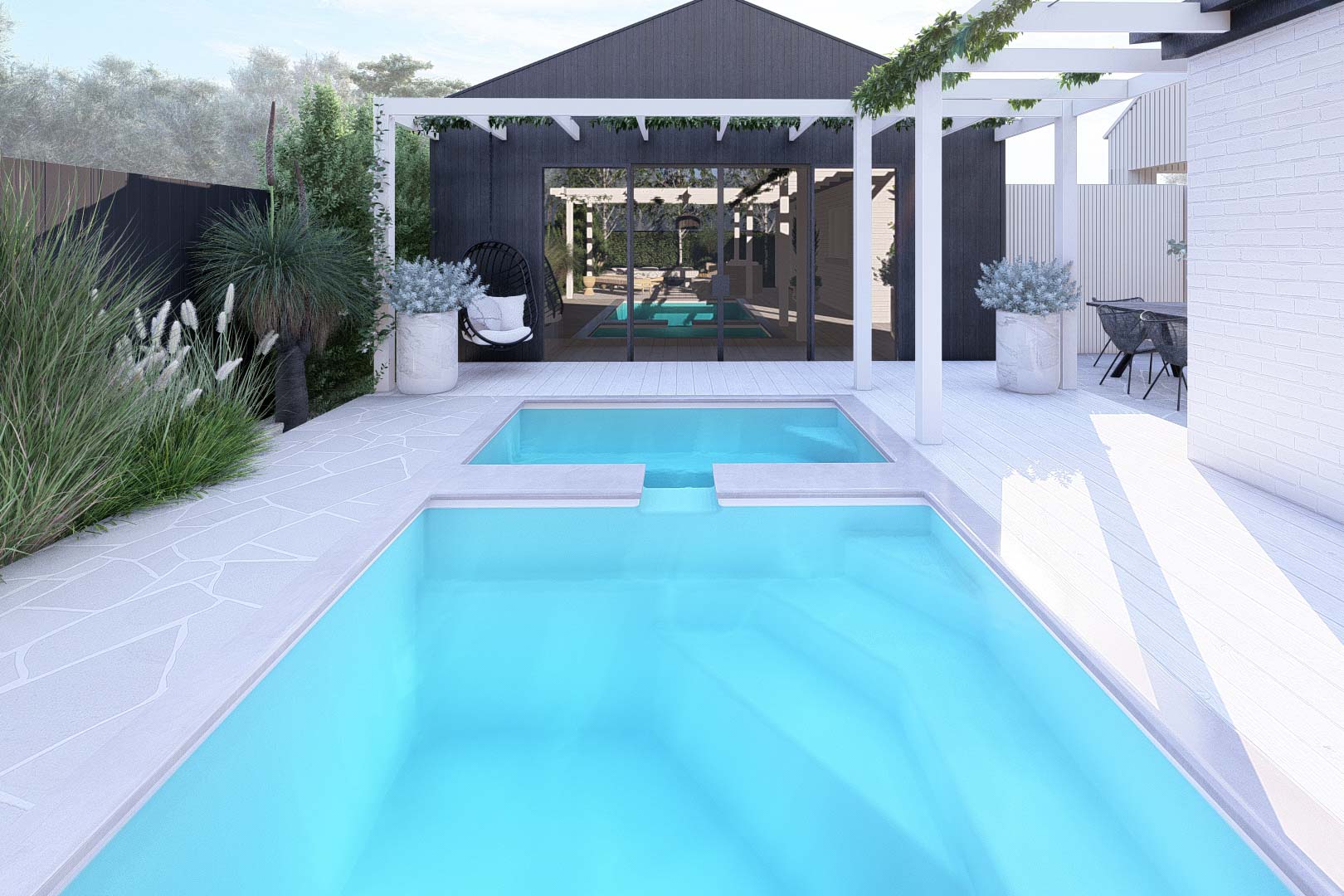 A stunning one piece configuration that has been designed with the whole family in mind. The entry point steps down into a versatile bench seat which runs the full length of the pool creating a generous seating & kids play area all in one. Designed with a spillway the pool and spa can run simultaneously eliminating any additional power costs, alternatively they can be run independently. The generous swimming area has been designed to be totally un-obstructed, which is ideal for swimming laps and active families. There is no other pool that can offer all of these features. With its square lines and designer looks we are sure your whole family will love it.