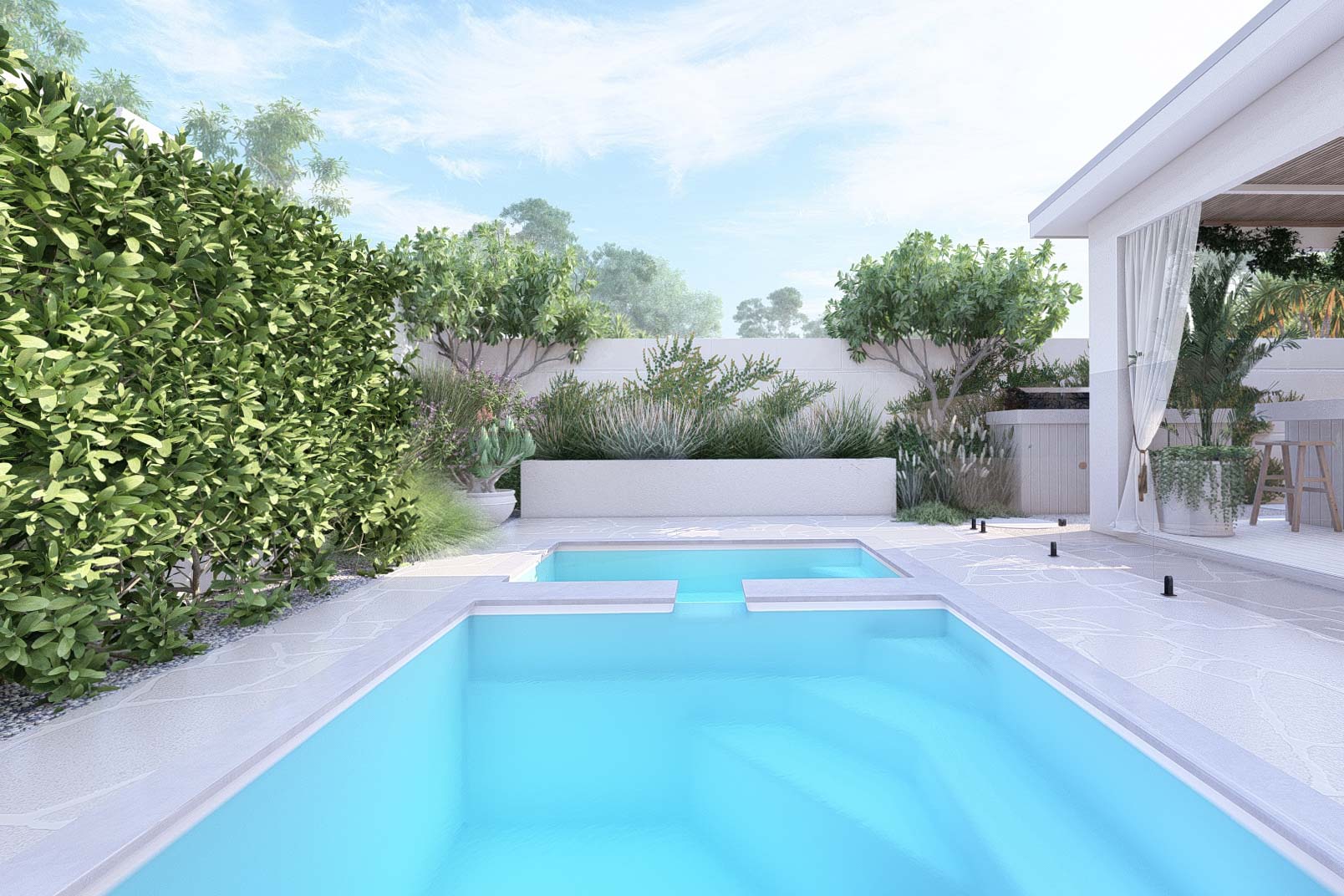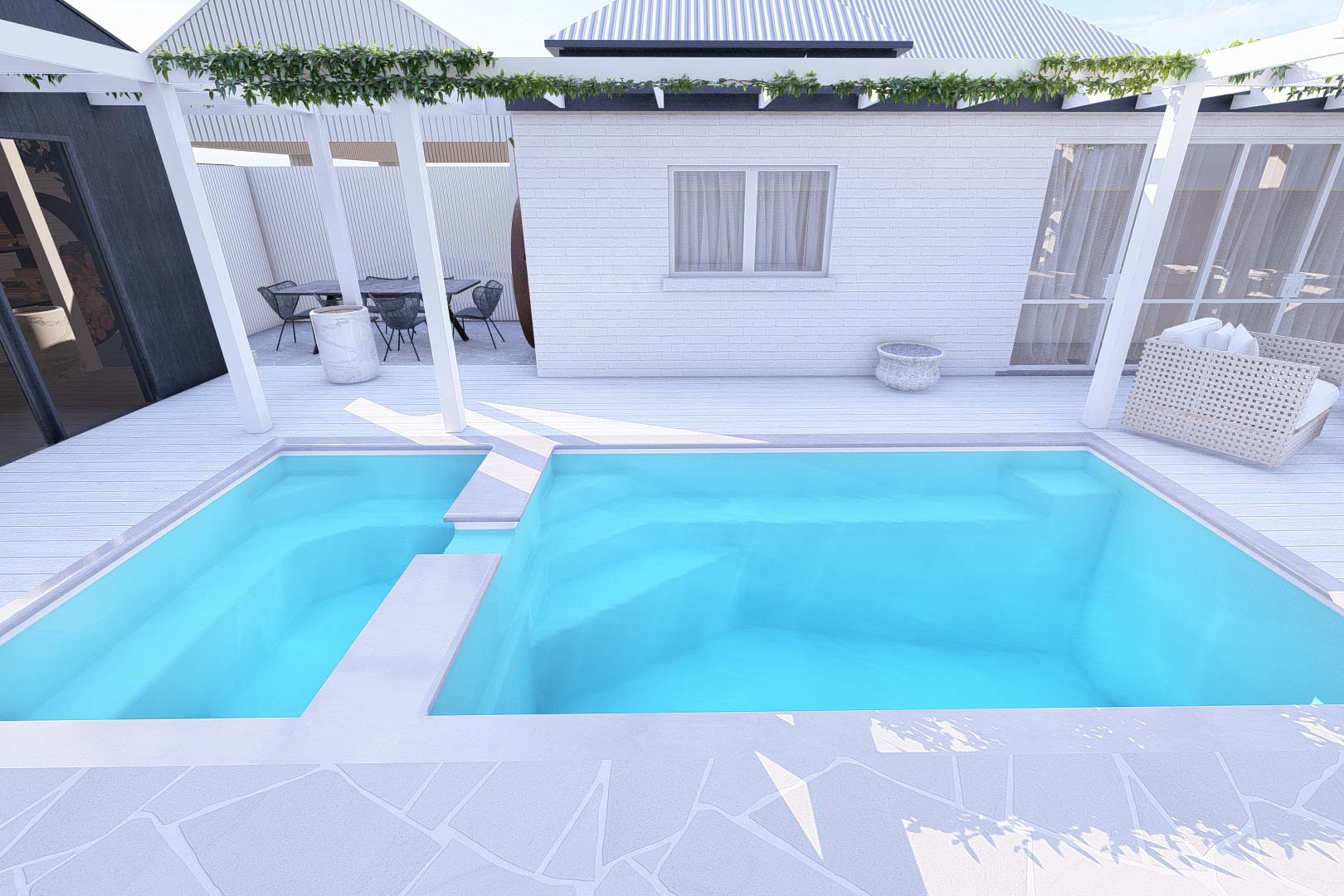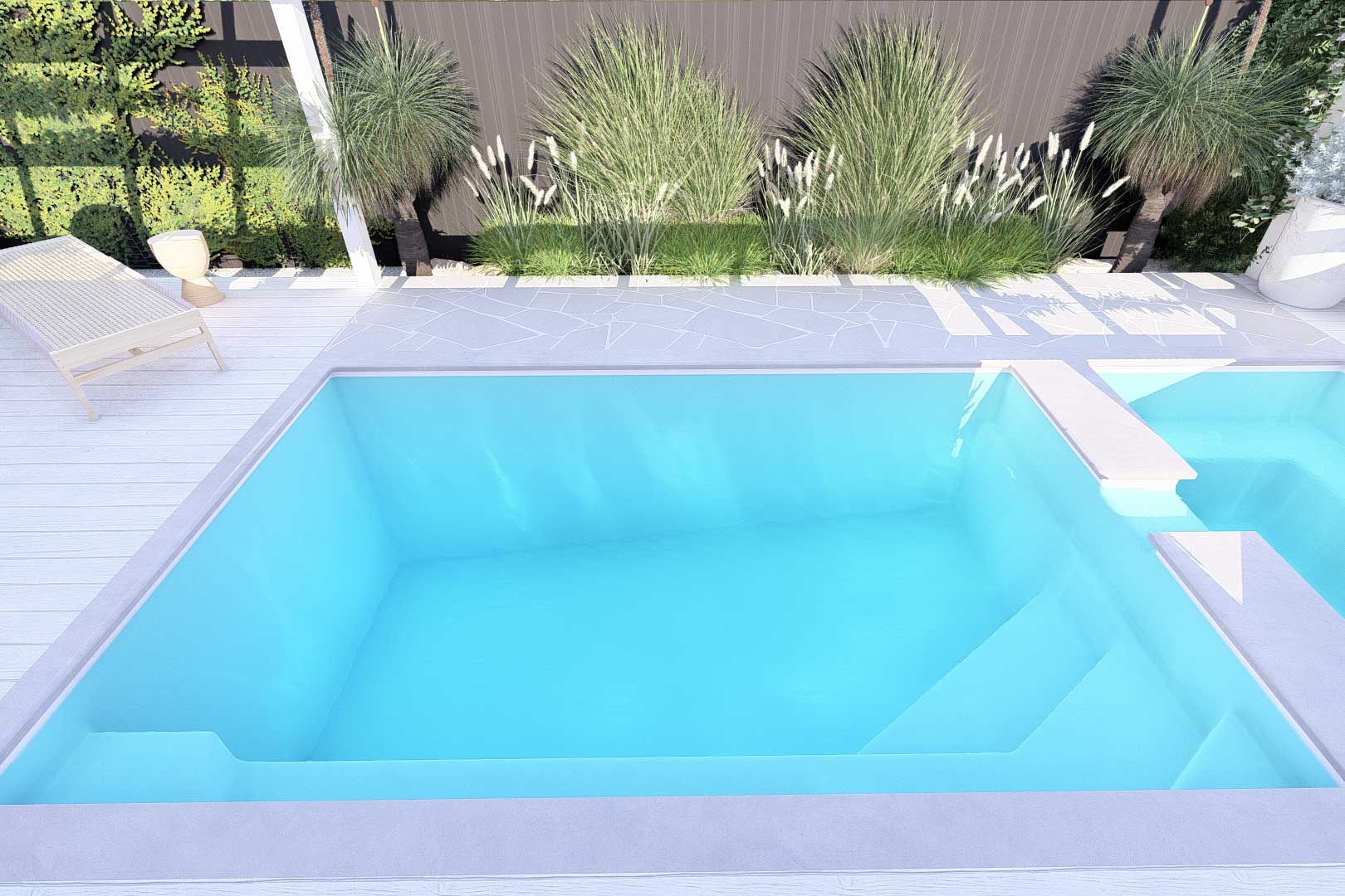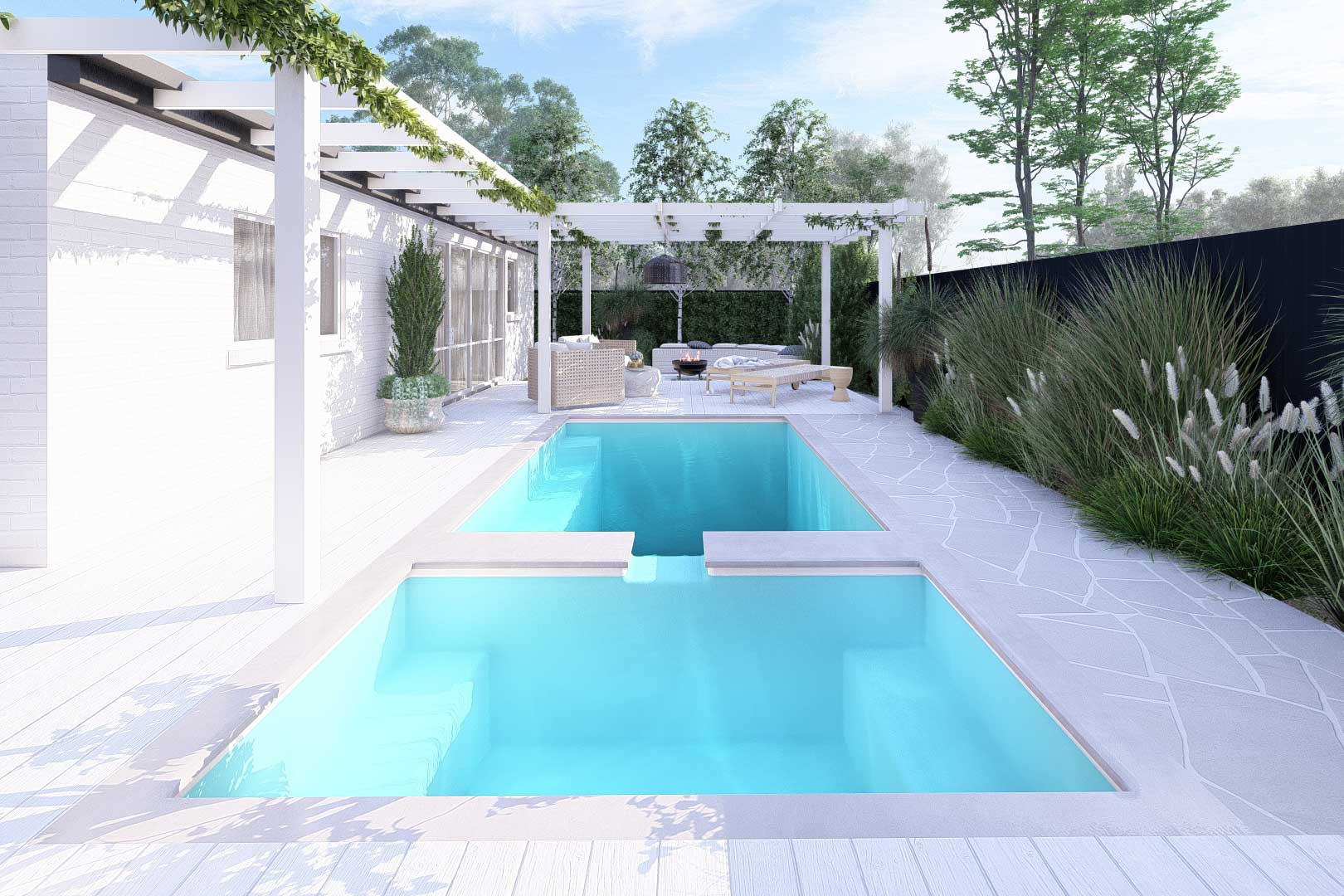 A stunning one piece configuration that has been designed with the whole family in mind. The entry point steps down into a versatile bench seat which runs the full length of the pool creating a generous seating & kids play area all in one. Designed with a spillway the pool and spa can run simultaneously eliminating any additional power costs, alternatively they can be run independently. The generous swimming area has been designed to be totally un-obstructed, which is ideal for swimming laps and active families. There is no other pool that can offer all of these features. With its square lines and designer looks we are sure your whole family will love it.